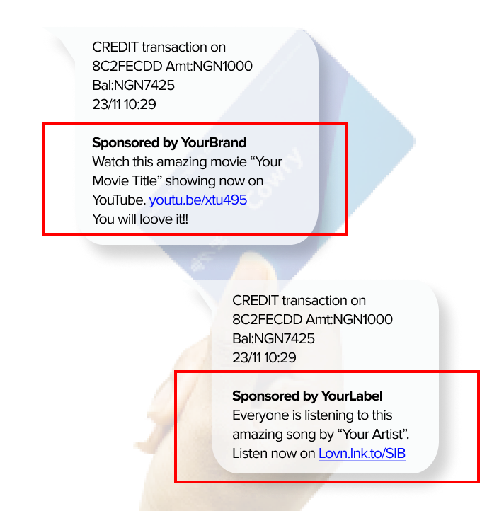 Your brand message or content is embedded into routine Cowry credit alerts, ensuring high visibility and instant engagement